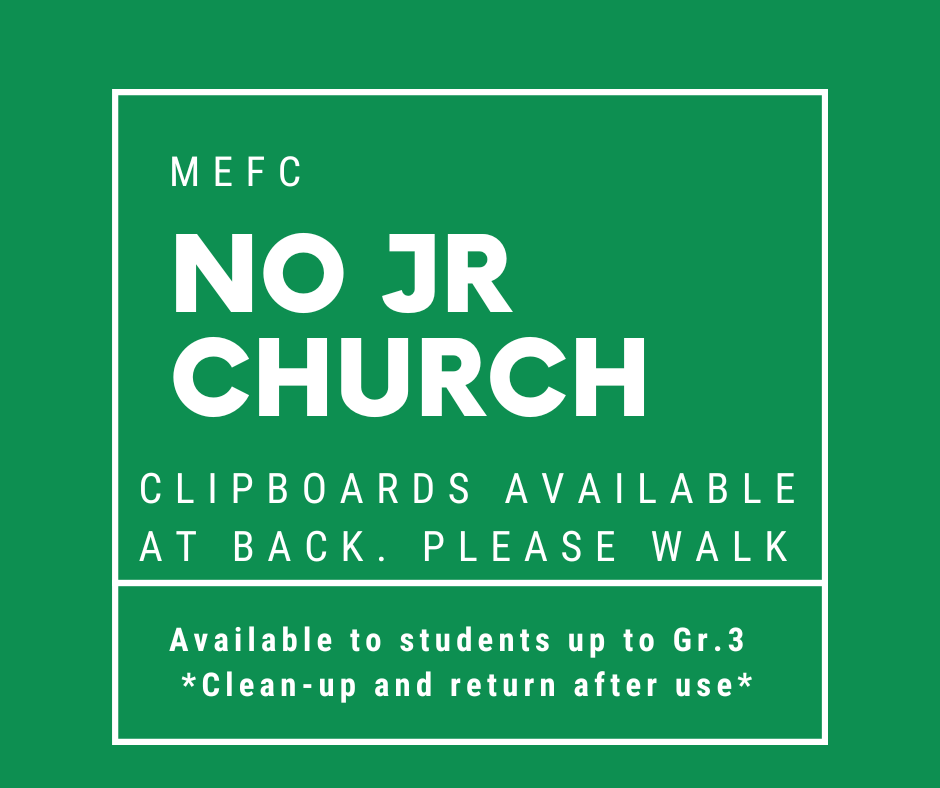 At this time, there is NO JR Church during the service hour. Clipboards will be offered for students up to Grade 3 to help them as they sit in on the service. Please be sure all garbages are cleaned up, markers closed and clipboards returned to the bin following the service.